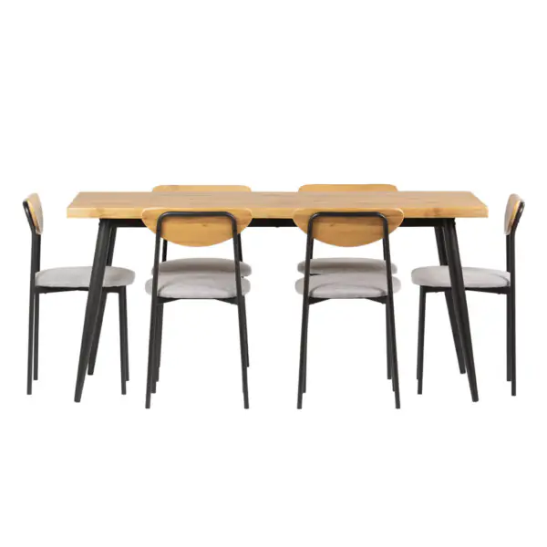 Zestaw składa się z 6 krzeseł, które doskonale dopełniają stół. Krzesła zostały wykonane z wysokiej jakości stali malowanej proszkowo, co zapewnia ich trwałość i stabilność. Siedzisko z pianką poliuretanową gwarantuje komfort użytkowania, a oparcie z płyty w okleinie dębowej doskonale współgra z całością.
