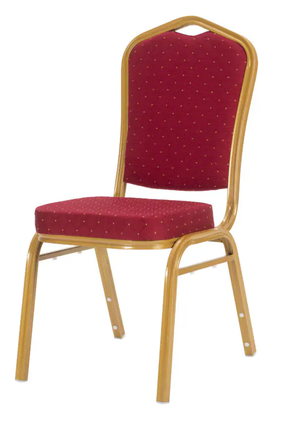 Siedzisko i oparcie pokrywa wysokiej jakości materiał tapicerski w kolorze głębokiej czerwieni. Tkanina z gęstym splotem i subtelnym wzorem złotych kropek nadaje prestiżowy wygląd. Siedzisko o grubości 5 cm wypełnia wysokiej jakości pianka poliuretanowa, która zachowuje sprężystość nawet po wieloletnim użytkowaniu. Dzięki temu krzesła bankietowe i krzesła konferencyjne zapewniają komfort siedzenia przez wiele godzin.