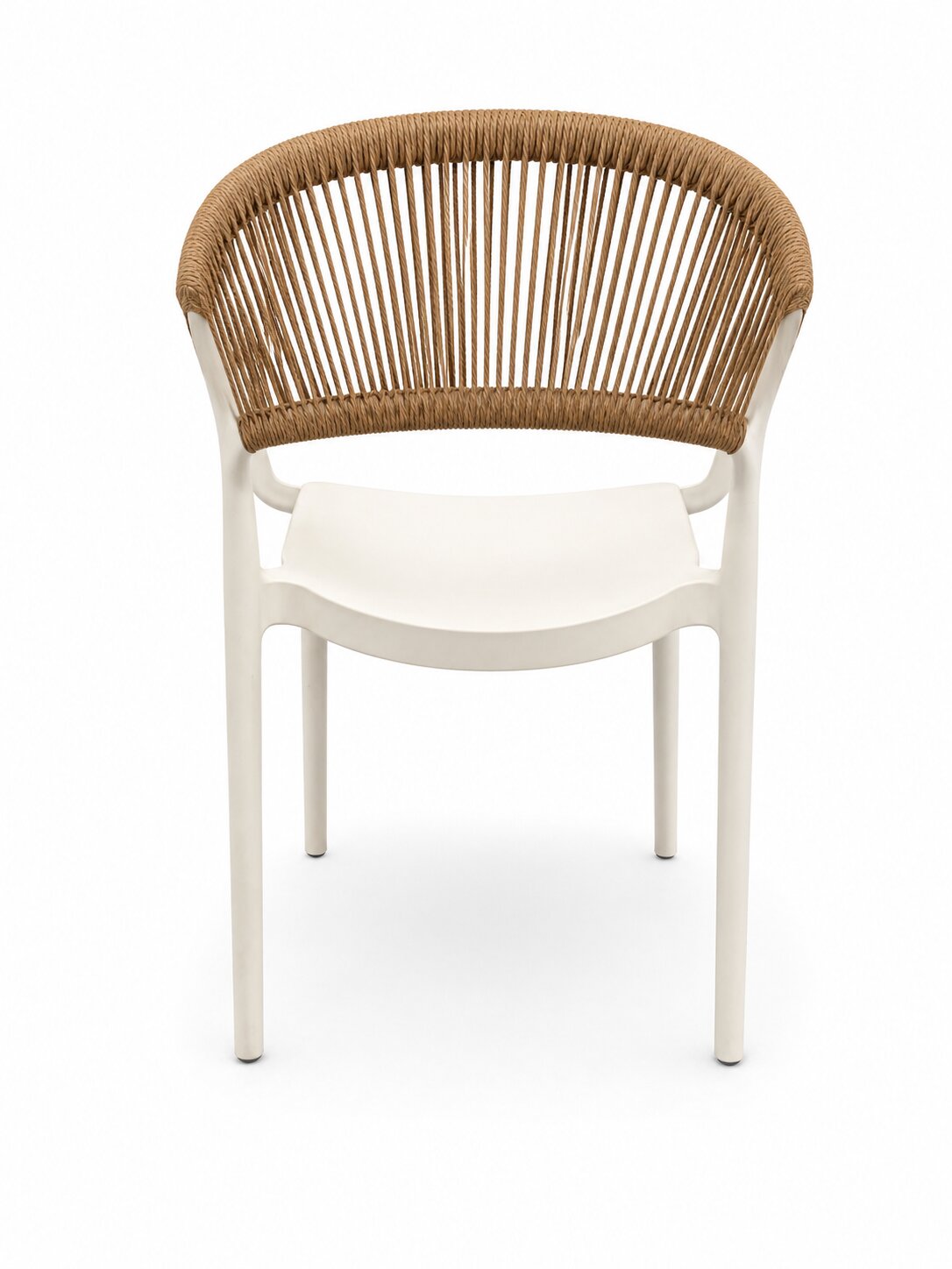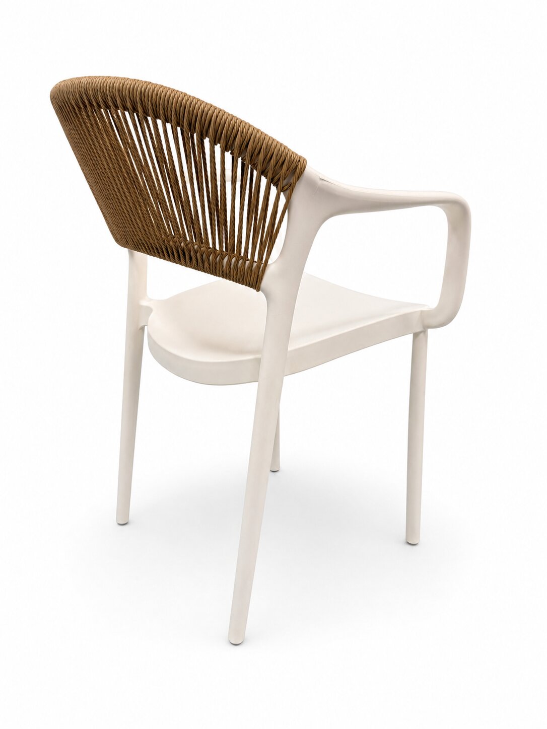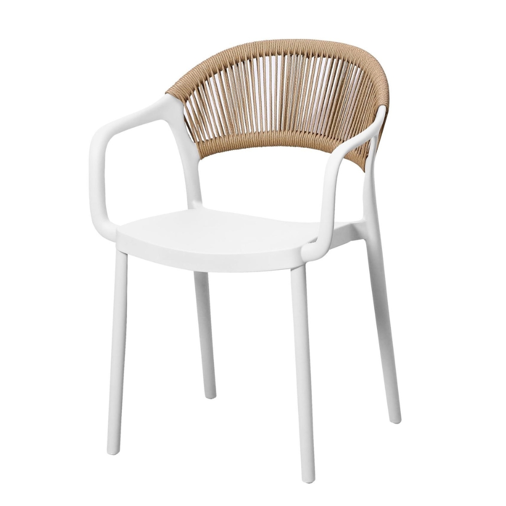 Krzesło ogrodowe kawiarniane Puro w kolorze biało-beżowym z podłokietnikami to propozycja dla osób, które cenią subtelną elegancję oraz naturalne inspiracje w aranżacji przestrzeni zewnętrznych, ponieważ połączenie jasnej konstrukcji z beżowym oparciem o plecionym charakterze tworzy harmonijną i lekką wizualnie całość, która doskonale wpisuje się w styl boho, skandynawski oraz nowoczesny, a jednocześnie pozwala stworzyć przytulną atmosferę sprzyjającą wypoczynkowi na tarasie, balkonie lub w ogrodzie.