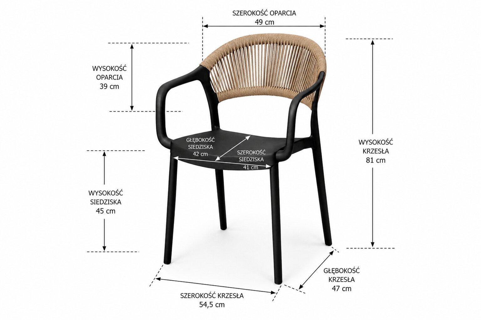 Krzesło zostało zaprojektowane z myślą o wygodzie użytkowania, gdzie wysokość całkowita wynosi 81 cm, wysokość oparcia 39 cm, wysokość siedziska 45 cm, szerokość siedziska 41 cm, szerokość całkowita 54,5 cm, szerokość oparcia 49 cm oraz głębokość całkowita 47 cm, co zapewnia komfortowe proporcje oraz stabilność podczas użytkowania.