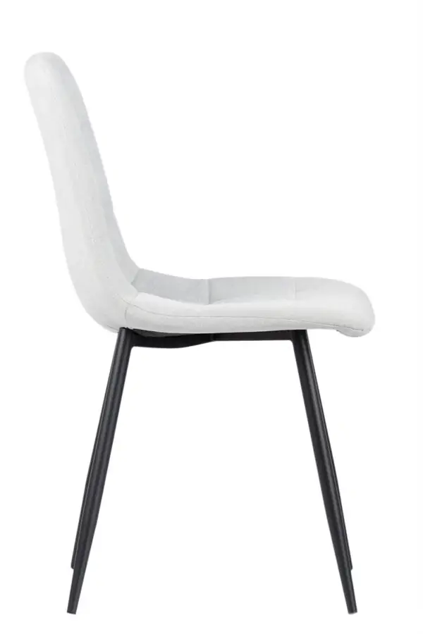 Połączenie jasnoszarej tapicerki z czarnymi, metalowymi nogami tworzy modny, kontrastowy efekt, który nadaje meblowi wyrazistości. Smukłe, malowane proszkowo nogi nadają konstrukcji lekkości, a zarazem zapewniają doskonałą stabilność. Dzięki minimalistycznemu wykończeniu, krzesło harmonijnie łączy się z otoczeniem, nie dominując go – to estetyczny detal, który uzupełnia aranżację, a nie przytłacza.