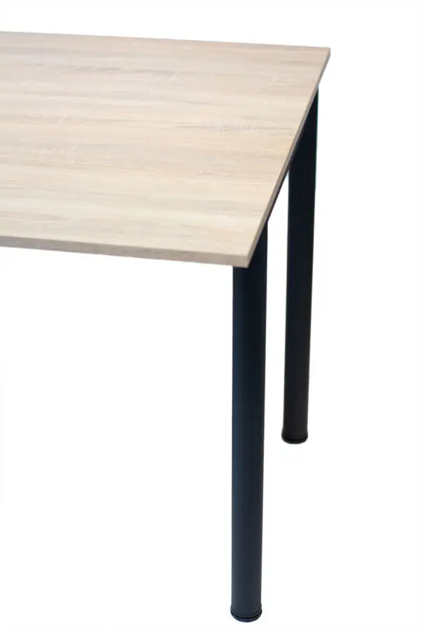- Praktyczne rozwiązania: Nogi o średnicy 5 cm wyposażono w antypoślizgowe stopki z tworzywa sztucznego, które chronią podłogę i zwiększają stabilność stołu. Blat nie posiada otworów montażowych, co daje większą swobodę użytkowania i ustawienia.