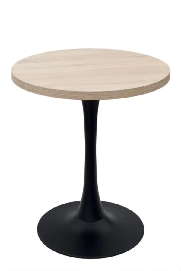 Stolik kawiarniany bankietowy o nowoczesnym designie, idealnie łączący elegancję z funkcjonalnością. Jego solidna konstrukcja oraz stylowe wykończenie sprawiają, że doskonale sprawdzi się zarówno w kawiarniach, restauracjach, jak i w domowych wnętrzach. Stolik wyposażony jest w okrągły blat o średnicy 68 cm w kolorze dąb sonoma, który nadaje mu naturalnego, ciepłego charakteru, a także czarną metalową podstawę, która gwarantuje stabilność i trwałość.