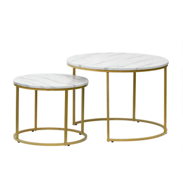 - Kolor: Biały marmurowy blat z subtelnymi, szarymi żyłkami pasuje do różnych aranżacji wnętrz, od nowoczesnych po klasyczne. Jasny kolor blatu sprawia, że stoliki stają się lekkim, ale eleganckim akcentem w pomieszczeniu.