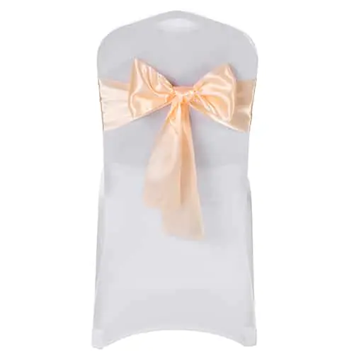 Szarfa wstęga na krzesła kolor brzoskwiniowy – ozdoby pasują na większość krzeseł bankietowych i nie tylko. Szarfy wymagają prasowania. Idealnie sprawdzą się na różnych uroczystościach w salach bankietowych i nie tylko.
