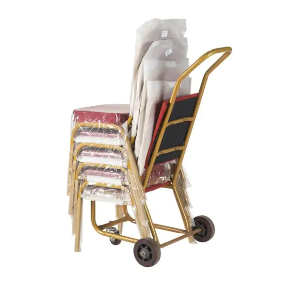 Metalowy wózek, służący do przewożenia krzeseł bankietowych. Na wózku można przewozić sztaple krzeseł do 18 sztuk. Bardzo praktyczne rozwiązanie dla osób mających na stanie dużo krzeseł.