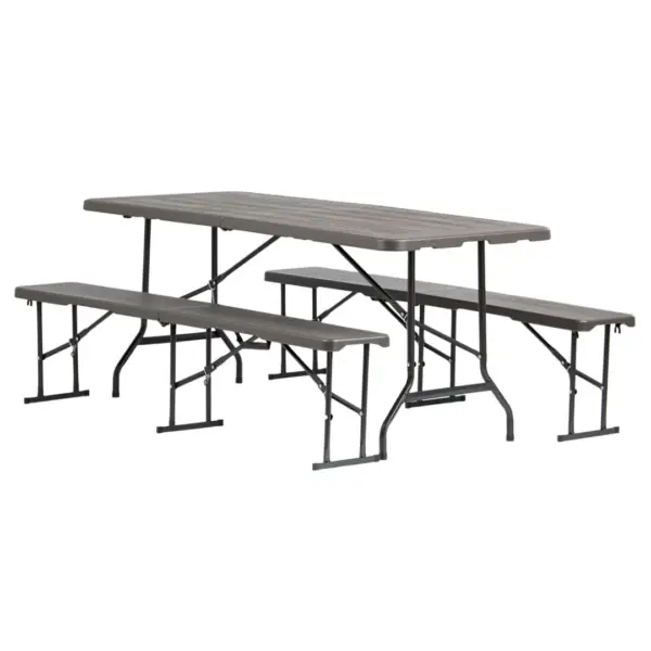Wyobraźcie sobie eleganckie meble ogrodowe, które nie tylko przyciągają uwagę swoim designem, ale także są funkcjonalne i łatwe w utrzymaniu. Nasz zestaw mebli cateringowo ogrodowych składa się z solidnego stołu w kolorze brunatno grafitowym oraz dwóch ławek, zapewniając wygodne miejsce dla Państwa gości.