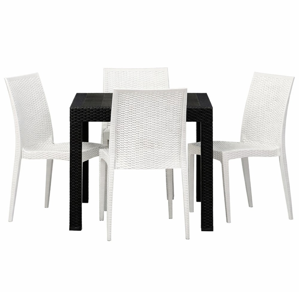 Zestaw mebli ogrodowych składający się z 4 białych krzeseł Havana oraz czarnego stołu Riviera to eleganckie i funkcjonalne rozwiązanie do ogrodu, na taras lub balkon. Kontrastowe połączenie bieli i czerni nadaje zestawowi nowoczesny charakter, który doskonale wpisuje się zarówno w minimalistyczne, jak i klasyczne aranżacje przestrzeni zewnętrznych. Komplet wykonany jest z trwałego polipropylenu z imitacją rattanu, dzięki czemu meble są odporne na zmienne warunki atmosferyczne oraz intensywne użytkowanie. To idealny zestaw mebli ogrodowych z imitacją rattanu, który sprawdzi się podczas codziennych posiłków na świeżym powietrzu, spotkań z rodziną czy relaksu na tarasie.