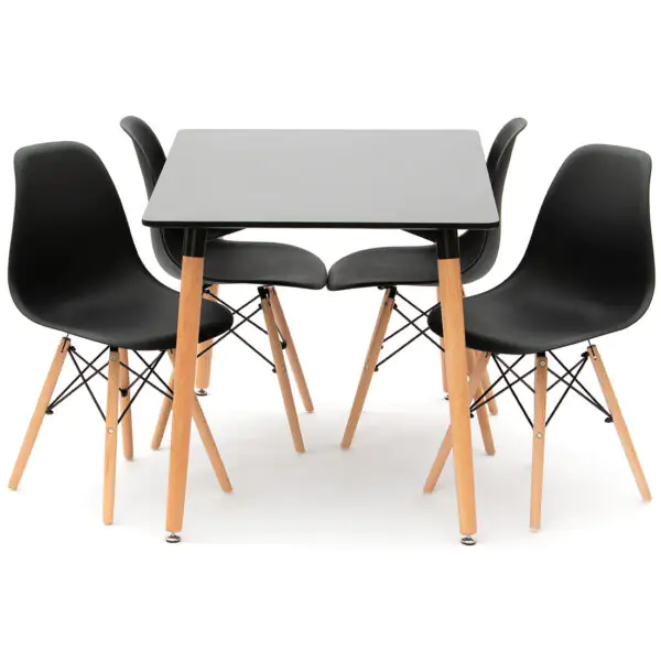 Pełny opis produktu Zestaw Stół 120x80cm + 4 Krzesła Nowoczesny Skandynawski Styl DSW czarny zestaw mebli nowoczesnych to idealne rozwiązanie wyposażenia pomieszczeń domowych takich jak salon czy kuchnia.  Skandynawski zestaw nowoczesny to idealny wybór dla osób, które cenią prostotę i funkcjonalność. Doskonale sprawdzi się w wyposażeniu salonu czy kuchni, na salach bankietowych, w lokalach gastronomicznych czy do użytku domowego.