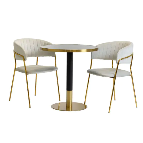 W towarzystwie stolika znajdują się dwa krzesła w stylu glamour, które zachwycają zarówno swoim designem, jak i komfortem użytkowania. Złote ramy krzeseł doskonale współgrają z wykończeniem stolika, tworząc spójną estetykę całej kompozycji. Obicie z miękkiego szarego weluru dodaje nie tylko luksusowego wyglądu, ale także zapewnia wygodę podczas długotrwałego użytkowania.